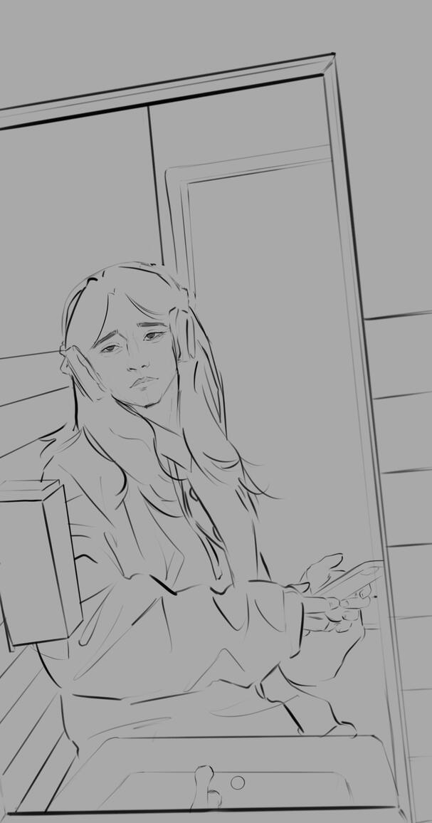 This is an example of a fullbody sketch completed in 1 hour. The setting is simple, yet qualifies for a more detailed backround (as it took most of the time)Clean linework, strong mood, and careful composition make this more than just a sketch — it qualifies as a scene.